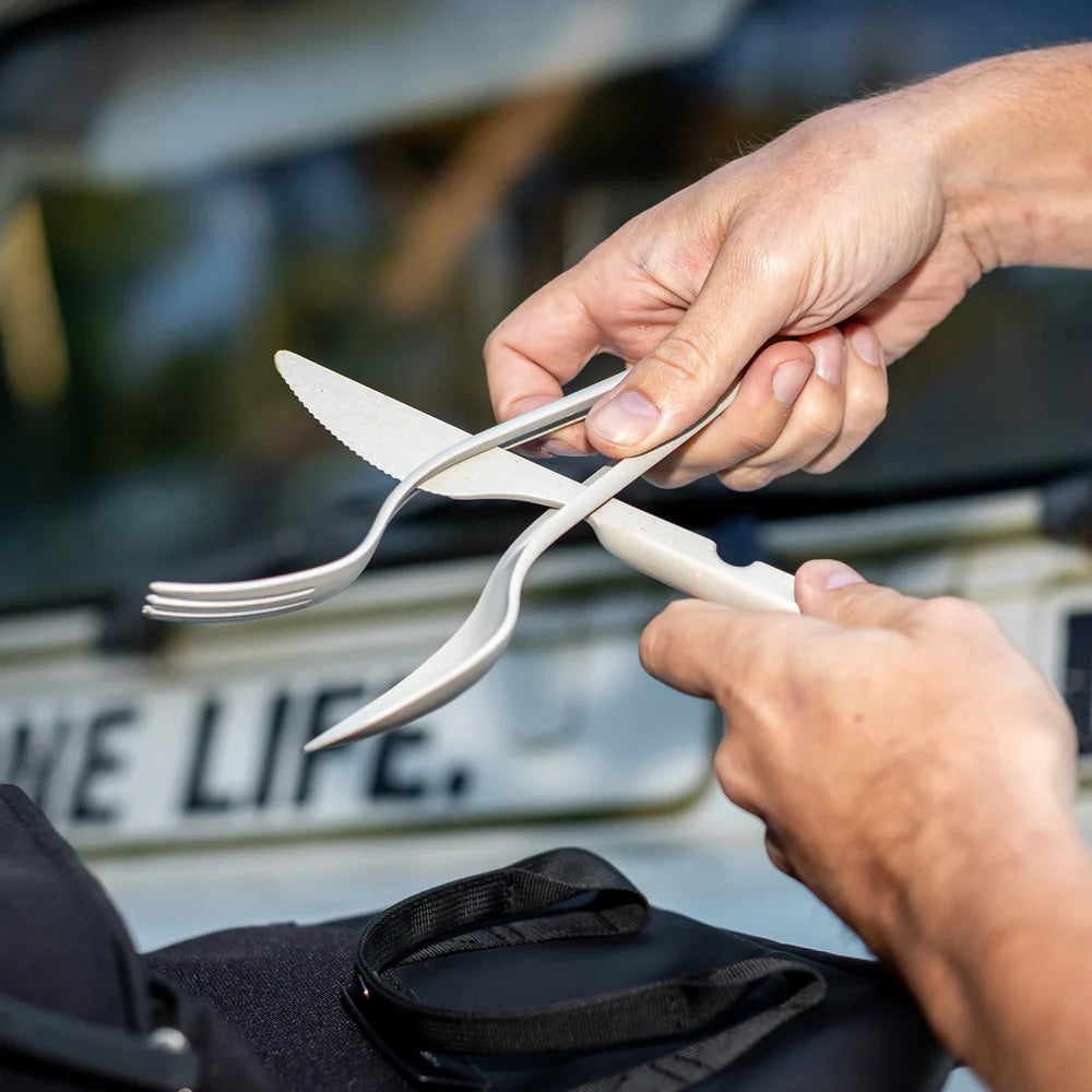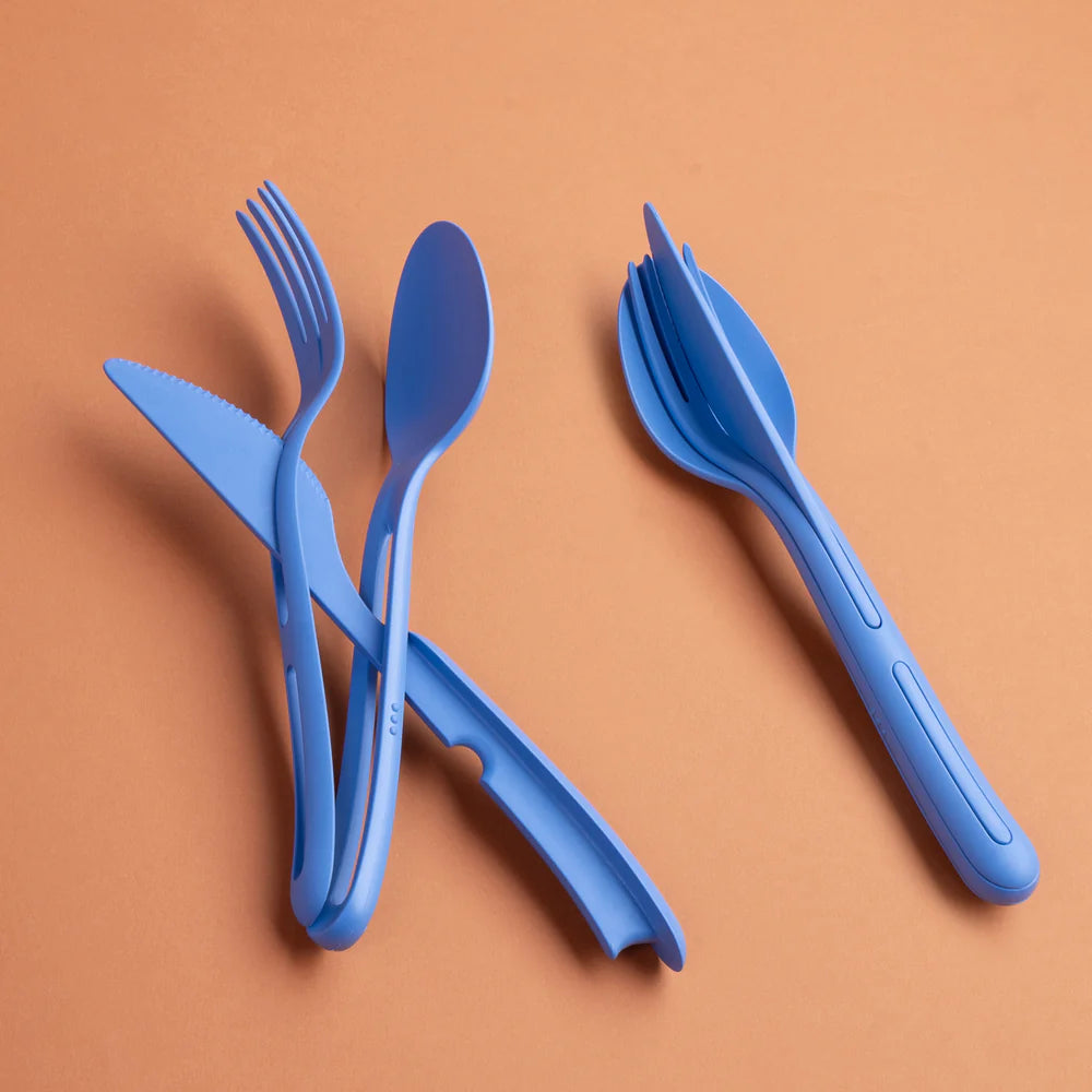 Knife, fork, spoon - done. Finally, there's a sensible, no-frills, and decently sized to-go cutlery set. No more balancing food to your mouth! All the pieces fit together and take apart without much guesswork. To release, simply lift the knife at the tip and pull it down. All the cutlery pieces fit comfortably in your hand and, thanks to their lightweight construction, fit in any bag.