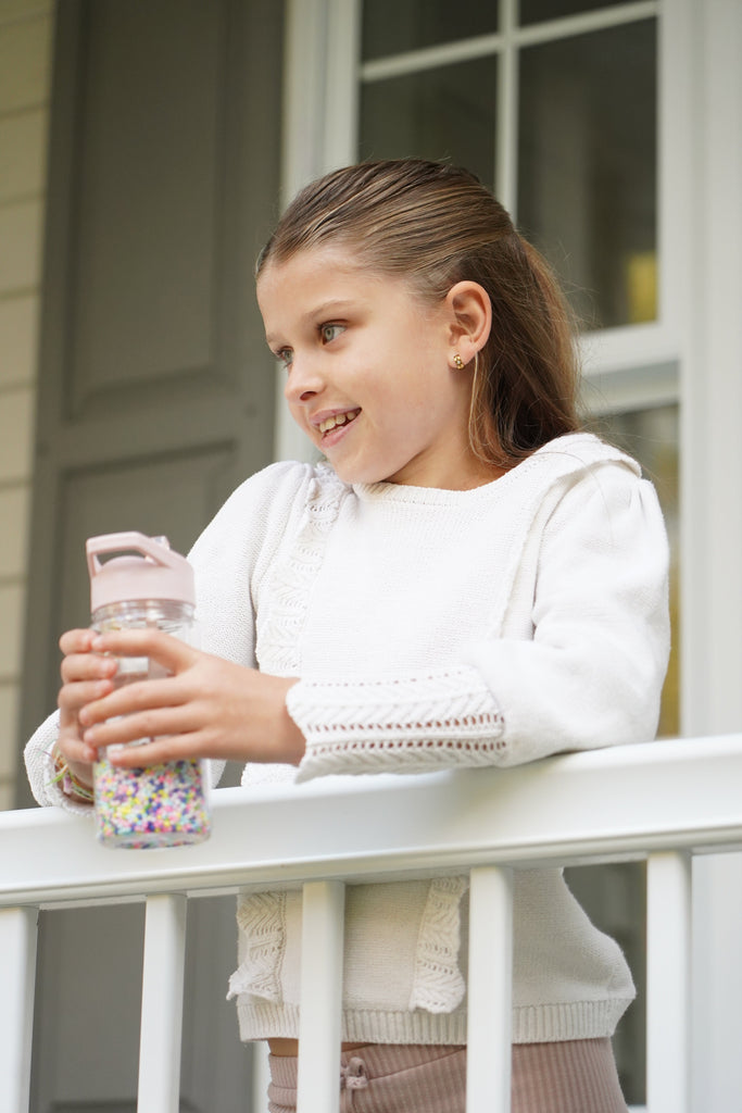 Our Double-Wall Water Bottle is designed with both fun and functionality in mind to help your little one stay hydrated. Adding a playful twist, the bottle includes balls or sparkles that move with a simple shake or flip of the bottle, turning every sip into a fun, interactive experience.