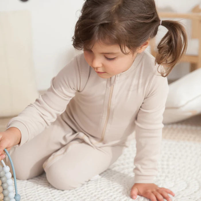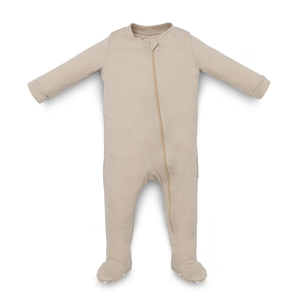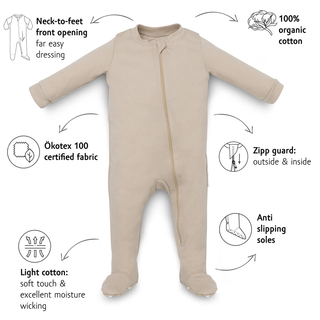 Cotton suit with closed feet, non-slip sole, and a zipper at the front.